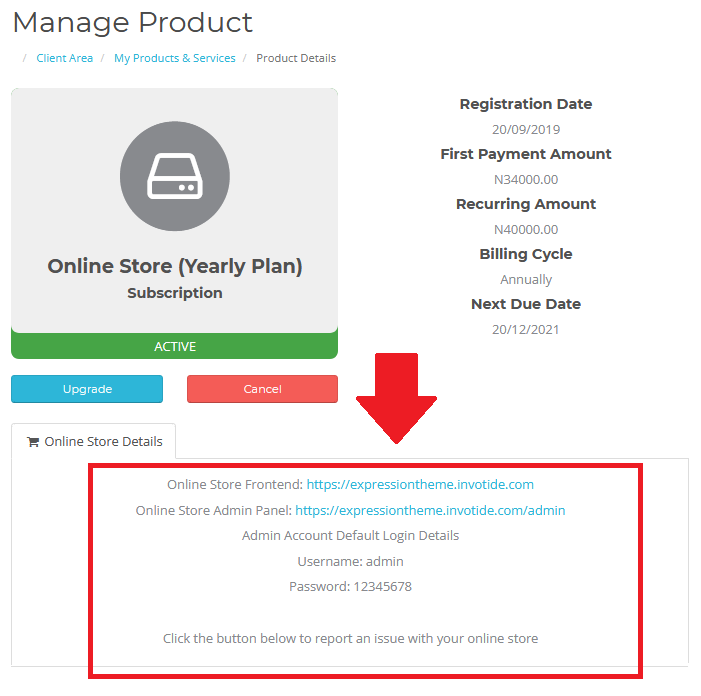 On the "Product Details" page, scroll down and you will see your online store admin panel login details as shown in the screenshot below.
